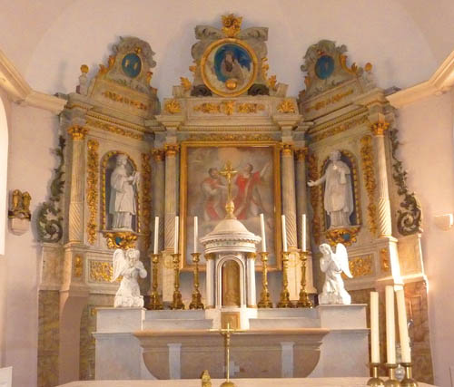 L’église fut reconstruite en 1842 à l’exception du clocher carré à toit pyramidal. Elle abrite un magnifique retable de la fin du XVIIe siècle provenant de l’ancienne église. Une peinture représentant Saint Ferréol et Saint Ferjeux en occupe la partie centrale. De nombreux retables furent construit en Haute-Saône à la fin du XVIIe siècle et au cours du XVIIIe siècle en réponse au développement de la fois protestante dans le Pays de Montbéliard. En effet, le retable est l’élément décoratif majeur de l’art de la Contre-réforme (baroque).